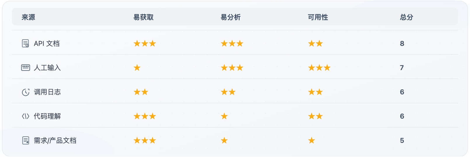 接下来,我将从智能 API 测试的角度拆解几个关键步骤和我们目前看到的一些产品层面的选择。首先,肯定要给 AI “投喂”更好的数据源,否则就会出现“垃圾进、废品出”的局面。我们当时考虑了各种可能的数据源,并从几个维度对它们进行了对比,大致排序如下:
