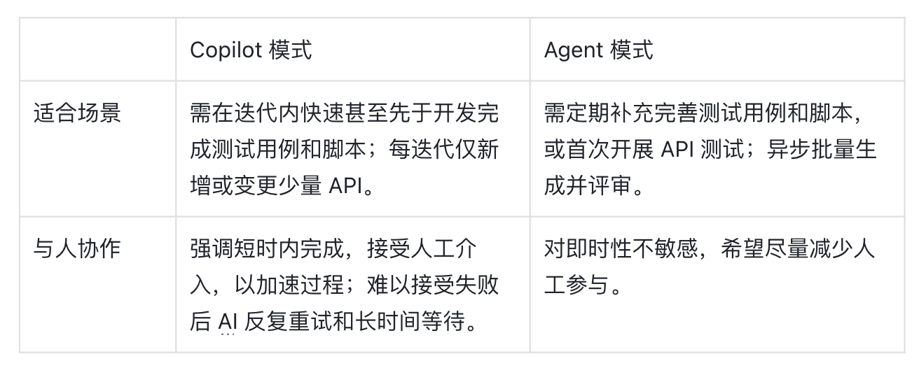 另一个关键选择是:Tester 应该如何帮助 QA 写测试?是像 Copilot 那样“在对话中辅助生成”,还是像 Agent 那样“一步到位直接交付”?我们来看两者的对比。